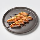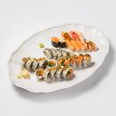 Serveras med flamberad lax, avokado, krabbstick, gurka, avokado, gräslök, chilimajonnäs och unagisås.