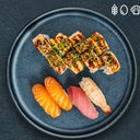 17 Stycken. Futomaki: 5 grillad lax. Uramaki: 8 lax. Nigiri: 2 lax, 2 grillad lax.