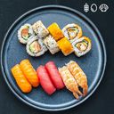 14 stycken. Uramaki 4 lax, 4 crispy ebi. Nigiri: 2 lax, 2 tonfisk, och 2 räka.
