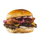 Kött, pepperjackost, bacon, tomat, saltgurka, rostad lök & aioli.