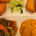 Friterad kyckling med sötsursås, Friterade räkor med sötsursås, Grillad kyckling med jordnötssås, Biff med bambuskott.