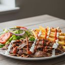 Serveras med gyros, isbergssallad, lök, tomat och feferoni