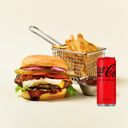 Valfri hamburgare, crispy wedges, valfri sås, valfri dryck
