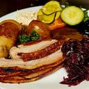 Serveras med potatis, rödkål, pressgurka, gelé och brunsås