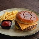 Grillad nötköttsburgare toppad med smält ost, isbergssallad, tomat, inlagd gurka, dressing. Serveras med pommes, dipp