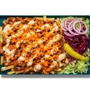 Kebabkött, ost, karamelliserad lök, chilimango currysås, friterade grönsaker, rostad lök och persilja. Ingår pommes
