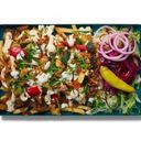 Kyckling, mixsallad, pommes, friterade grönsaker, fetaost, rostad lök, persilja, feferoni och chili mango curry sås