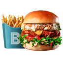 Bröd, kött (90g), cheddarost, burgardressing, krispsallad, BBQ stekt lök, kalkonbacon & BBQ-sås. Inklusive pommes