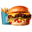 Kött (2x90g), cheddarost, kalkonbacon, saltgurka, rostad lök, vitlöksmajonnäs. Inklusive pommes & läsk