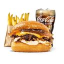 "Här får du vår populära Yorker-burgare tillsammans med mellan pommes, dricka, en cheeseburgare samt 4 st chili cheese"