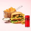 1 valfri burgare, 2 crispy chicken tenders, pommes, valfri sås och valfri dryck