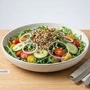 Serveras med ruccola, tomat, gurka, rödlök, rostade frön och husets dressing