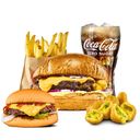 "Här får du vår populära Yorker-burgare tillsammans med mellan pommes, dricka, en cheeseburgare samt 4 st chili cheese"