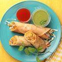 Serveras med 1 vårrulle, grillad kycklingspett med jordnötssås, kycklingfilé med sweet chilisås och cashewnötter