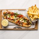 Grillat kycklingbröst, krispigt bacon, skinka, tomat, krispsallad och majonnäs i rostat vitt bröd. Serveras med pommes frites och coleslaw.