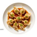 Nöttfärs, vitkål, morot, potatis och deg krydda. Serveras med yoghurt och sås.