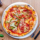 Tomatbotten med smält mozzarella. Toppad med röd pesto, grön pesto och mozzarella. Strös med parmigiano reggiano.