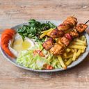 Två saftiga kycklingspett, marinerade i våra egna kryddor och kolgrillade till perfektion. Serveras med ris eller pommes frites, färskt bröd, hummus, muhammara och tzatziki.