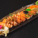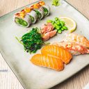 1 lax, 1 räka, 1 avokado, 4 rullar, lätt halstrad: 2 lax, 1 tonfisk, 1 räka, röda sesamfrön och unagisås.