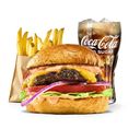 Briochebröd, 114 gram svenskt nötkött, dubbel cheddarost, hellamns majo, silverlök, pickles, ketchup & senap. Medium fries & dricka ingår.