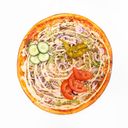 Tomatsås, ost, köttfärs, skinka och räkor.