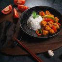 Wokade krispiga kycklingbitar med lök och paprika i PONGs klassiska sötsursås. Serveras med ris. (10 bitar)