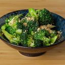 Wokad broccoli med vitlök, chili och ostronsås. Toppad med hackade jordnötter