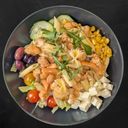 Sallad med handskalade räkor, rödlök, ruccola, parmesan, olivolja, nymalen svartpeppar och havssalt