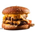 Triple cheeseburger with tomato, lettuce, cucumber, dressing, caramelized onion.