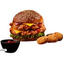 Double cheeseburger with caramelized onions, bacon (fries with red onion, melted cheese and fried egg).