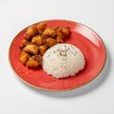Saftig kyckling i en söt och syrlig apelsinsås, serverad med ris och grönsaker.