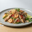Serveras med innehåller jordnötter, risnudlar wokade räkor, kycklingfilé, biff och färska grönsaker