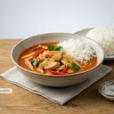 Den röda curryn består bland annat av röd chilifrukt, färsk koriander, kummin, kryddnejlikor och galangal som. Tillagas med bambuskott, kokosmjölk, färsk aubergine och paprika. Curryn kryddas med fiskbuljong, limeblad, färsk basilika och har smak av krämig kokos