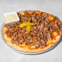 Pizza med oxfilé, champinjoner, lök och bearnaisesås.