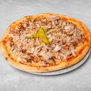 Pizza med kyckling isbergssallad, tomat, lök, peperoni och sås.