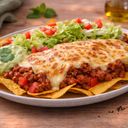 Serveras med köttfärs, mozzarellaost, nacho chips, sallad och valfri sås
