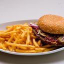150 gram högrevskött, dressing ,senap, ketchup, sallad, gurka och lök. Serveras med pommes