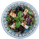 Ruccola, granatäpple, mynta, valnötter, rödbetor, olivolja, granatäppelsirap. Citron, timjan och fetaost + bröd. Vegetarisk-vegan-glutenfri