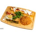 på bilden ser man fyra korvar och mycket mera kött. rismängden är för ett barn. Jag känner mig fullständigt lurad.