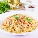 Pasta med lök, bacon, ägg, svartpeppar, sambal och gräddsås.