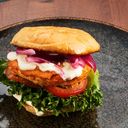 En saftig burgare med halloumi, grönsaker och en smakrik sås i bröd.