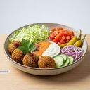 Sallad med falafel, isbergssallad, tomater, gurka, lök, feferoni, kebabsås mild, vitlökssås och nybakat bröd