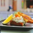 Serveras med klassisk Skagen med löjrom och smörstekt toast och citron.