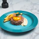 Tärnad Oxfilé, stekt potatis, sauterad gul lök, senapskräm och äggula