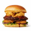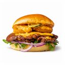 Brioche bröd, kött, karamelliserad lök, cheddar, dressing, inlagd gurka, barbequesås.