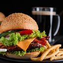En smakrik hamburgare där saftigt nötkött möter krispigt bacon, skapar en läcker kombination av salt och rökig smak i varje tugga.
