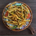 Tomatsås, ost, kyckling, tomat, gurka, lök, fefferoni, pommes