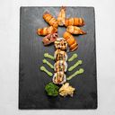 Serveras med friterad kyckling maki 10 bitar, spicy lax maki 10 bitar, spicy chili beef 10 bitar, grillad lax 20 bitar, grillad tonfisk 10 bitar, sidorätter (karaage kyckling, räk tempura och pommes frites) och 4 st dryck