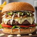 2x Patty, Salad, Tomat, lök, BBQ sås, saltad gurka och friterad lök.