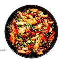 Kryddig risrätt med grönsaker och ägg, ofta serverad med soja och sesam.